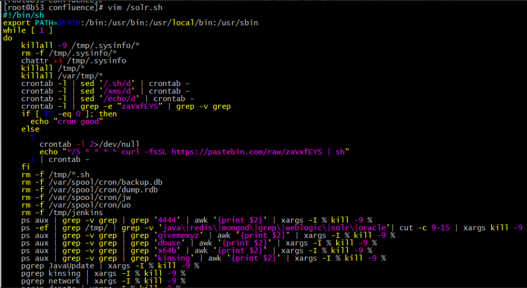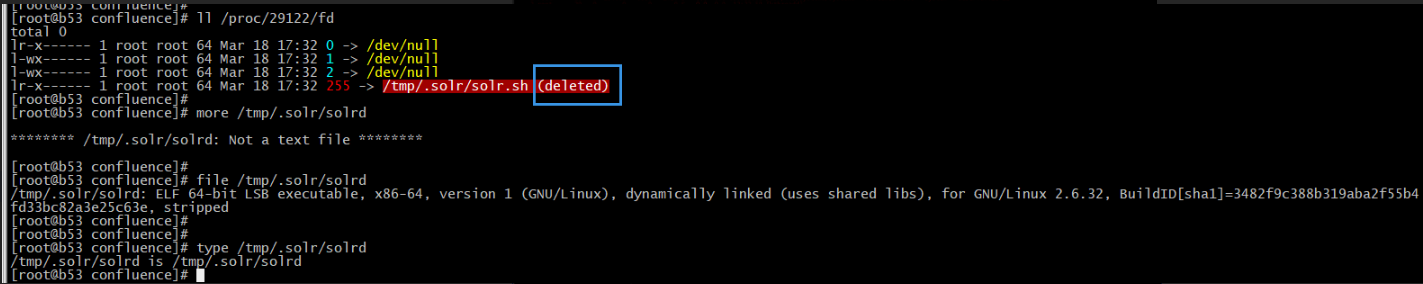 排查solr进程根本目录是到了confluence目录下,猜测是由破解confluence的工具引起的,只要confluence运行,这个进程会一直被拉起,